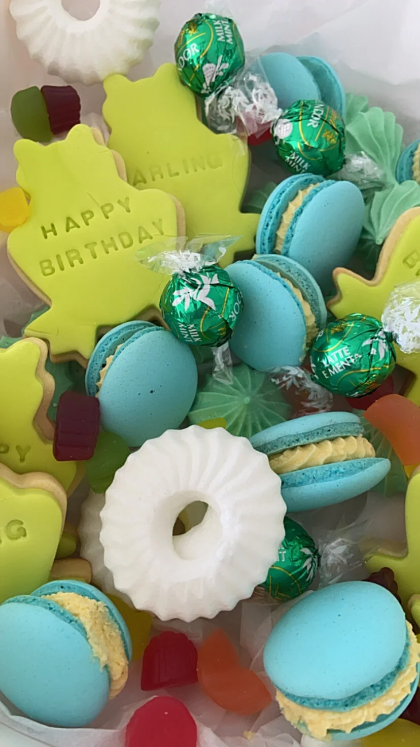Each sweetbox is made to order and comes in small and large sizes. The small box consists of 5 personalised cookies of your choice in text and colour. Five large cupcakes and a variety of sweets to suit your colour theme. $55